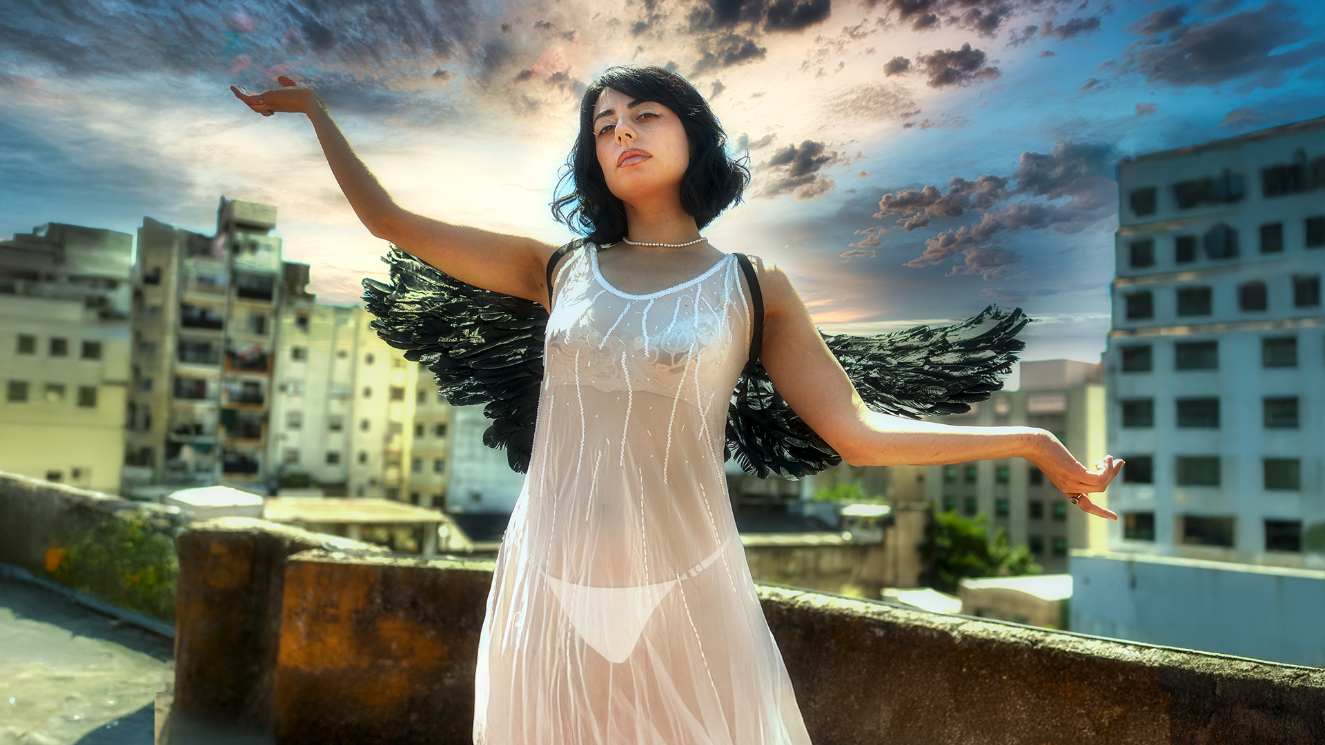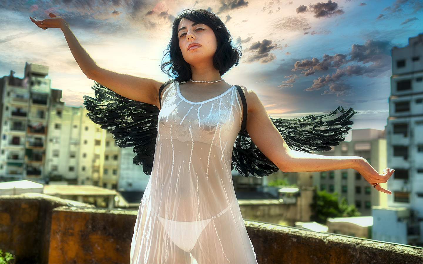 Shooting fotográfico con la bella y misteriosa reina del tarot Camila Sapphira que permitió retratar su figura angelical y que luego al subir a la terraza desplegó sus alas y partió hacia lo desconocido. Fue durante el Shooting "Crazy" realizado en Buenos Aires a mediados de Diciembre de 2024.